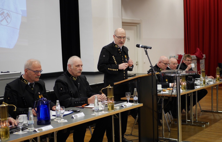 Er warf in seiner Laudatio zur Ehrung der Jubilare einen Blick in die Gegenwart und Zukunft des Bergbaus von Salzen, Erden und Braunkohle. Die Jubilare hatten während ihrer beruflichen Tätigkeit großen Anteil am technologischen Fortschritt und der Weiterentwicklung der Bergbautechnologie. Kamerad Klare zeigte am Beispiel der 5 weltgrößten Firmen der Bergbaubranche die derzeitige Renaissance des Bergbaus auf.