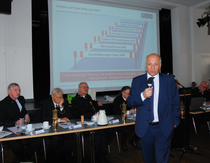 Er berichtete in seinem interessanten Vortrag über die Gesamtsituation der RAG von 1996 bis heute wie Schließungen, Wirtschaftskrisen, sozialverträglicher Auslauf und Personalabbau und die Herausforderungen für die RAG nach Beendigung des Steinkohlenbergbaus mit den interessanten Themen wie Wasserhaltung, Ewigkeitslasten und dem Strukturwandel im Ruhrgebiet, an der Saar und in Ibbenbüren.