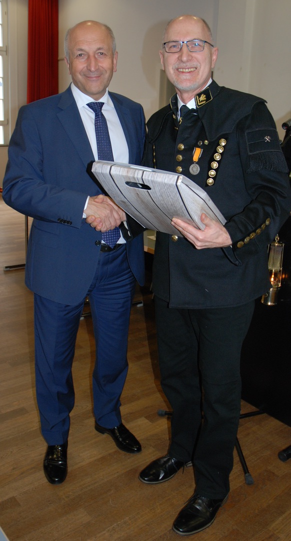 Der Bürgermeister der Stadt Dinslaken Herr Dr. Michael Heidinger hob in seiner Grußbotschaft die enge Zusammenarbeit mit dem BV Niederrhein hervor. Durch den Bergbau hat sich die Stadt von einem kleinen Dorf zu einer stolzen Mittelstadt entwickelt, in der nun der Strukturwandel auch in neuen Ansiedlungen entwickelt und angekommen ist. Der Wandel von den fossilen zu den regenerativen Energieträgern ist in Dinslaken sichtbar. Das Netzwerk des RDB hat zu diesem Erfolgsmodell mit beigetragen. Dem ersten Bürger der Stadt Dinslaken wurde mit 6 weiteren Kameraden nach der Jubilarehrung feierlich die Mitgliedsnadel und der Mitgliedsausweis des BV Niederrhein überreicht.