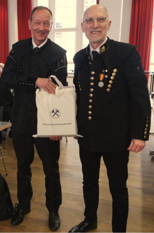 Die sehr umfangreiche Jubilarehrung von 96 Jubilaren des BV-Niederrhein, von denen 34 anwesend sein konnten, übernahm in diesem Jahr der Vorsitzende des RDB-Hauptvorstands Prof.-Dr. Drebenstedt. Zunächst einmal nahm er in seinen einleitenden Worten Stellung zu unserem RDB und seinen Bezirksvereinen und Bezirksgruppen. Vereine sind Teil der Kultur eines Landes. Auf die interne Organisation von Vereinen und Verbänden sollte Politik keinen Einfluss haben, denn sie spiegeln die Gesellschaft eines Staates wieder. Die Mitgliedschaft in einem Verein verlange sowohl Verantwortungs- und Pflichtbewusstsein als auch Zivilcourage. Dieses ist in einer Zeit wie heute wichtiger denn je. So schlug Kamerad Carsten Drebenstedt einen großen Bogen über Weltpolitik und Weltmarkt in Verbindung mit globaler Umweltpolitik unter Bezug auf Pandemie und aktuellen Kriegsschauplätzen. Dahingehend müssen wir unser Rohstoffbewusstsein stärken, denn die Problematik liegt nicht darin, dass uns die Rohstoffe ausgehen könnten, sondern wie wir diese verantwortungsvoll und nachhaltig nutzen (Zitat aus seinem Buch „Reise in die Welt der Rohstoffe“; unter ISBN 978-3-86012-677-6 veröffentlicht).