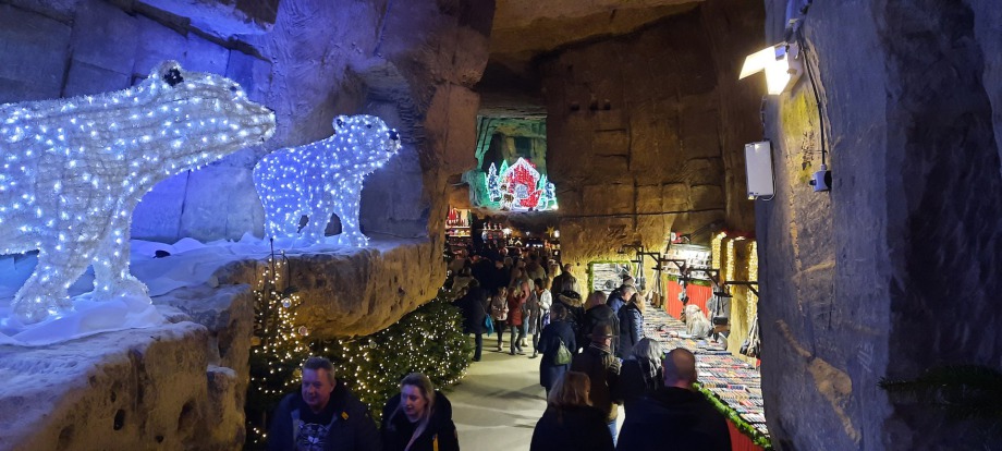 In der 'Kerststad Valkenburg' angekommen besuchten wir nun mit der „Gemeindegrotte“ den größten und ältesten unterirdischen Weihnachtsmarkt in Europa. Ein Rundgang führte entlang der beeindruckenden Wandmalereien und Skulpturen. Wir wurden durch die ungewöhnliche Umgebung und schöne Dekoration der langen Gänge mit den angebotenen Weihnachts- und Geschenkartikeln beeindruckt.